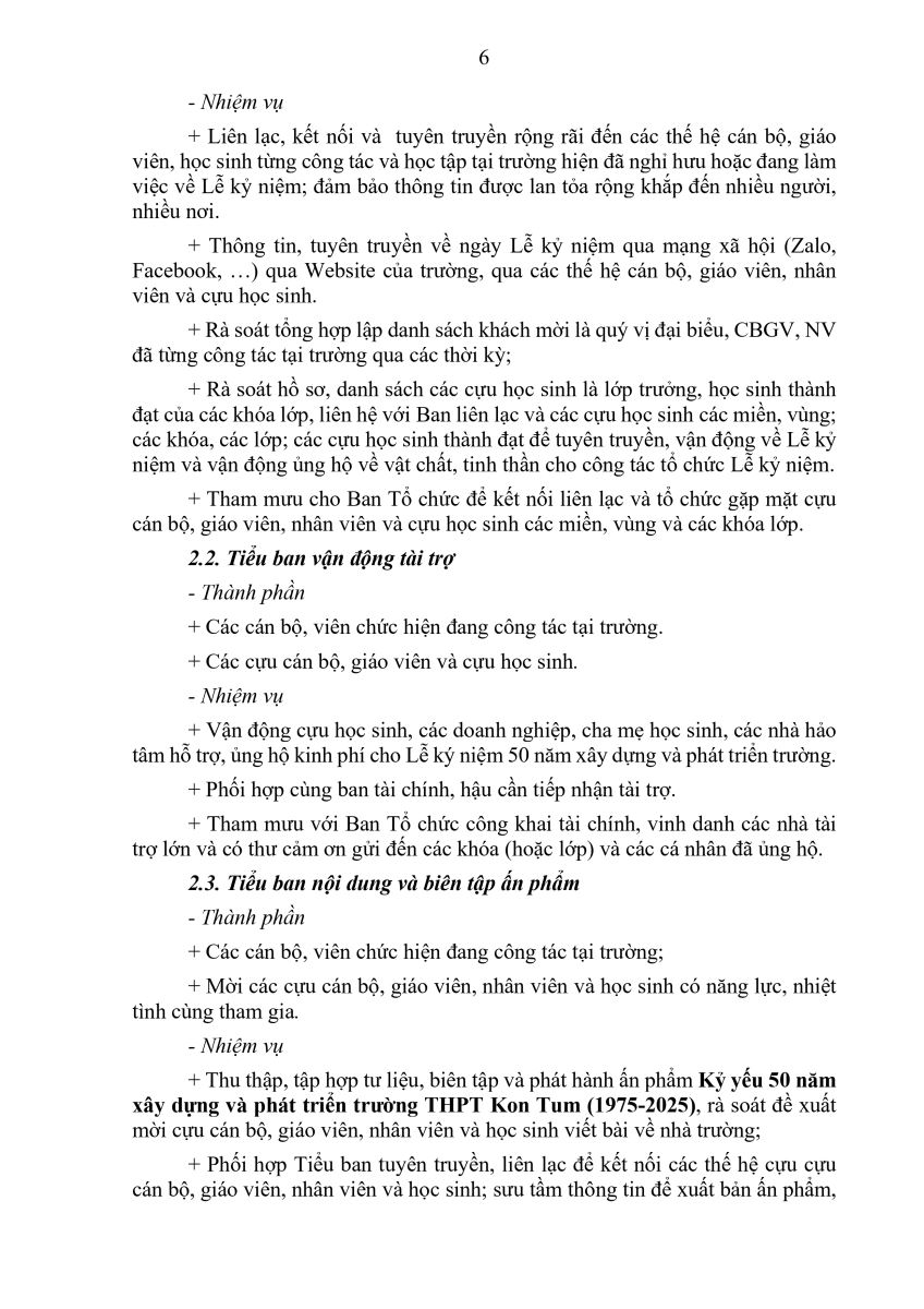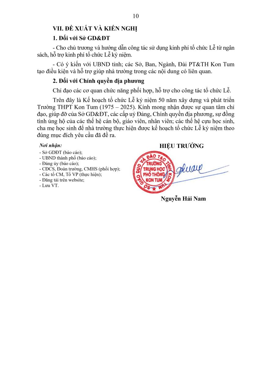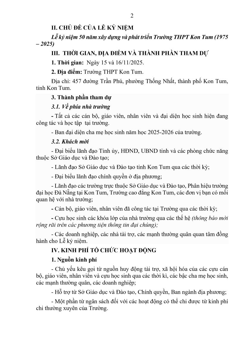KẾ HOẠCH TỔ CHỨC LỄ KỶ NIỆM 50 NĂM XÂY DỰNG VÀ PHÁT TRIỂN TRƯỜNG THPT KON TUM (1975 – 2025)