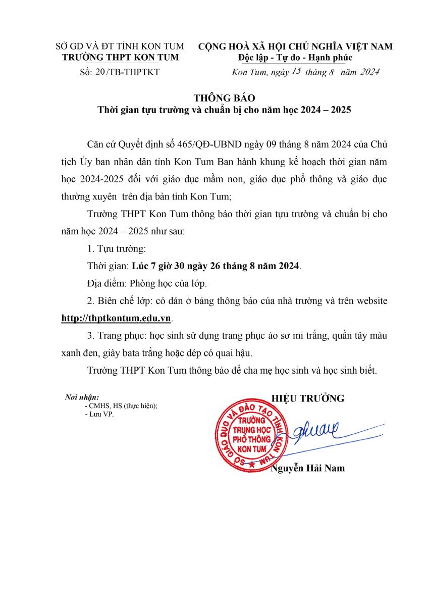 Trường THPT Kon Tum thông báo lịch tựu trường và chuẩn bị cho năm học 2024 - 2025 như sau: