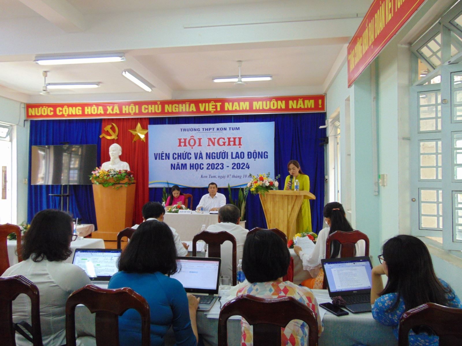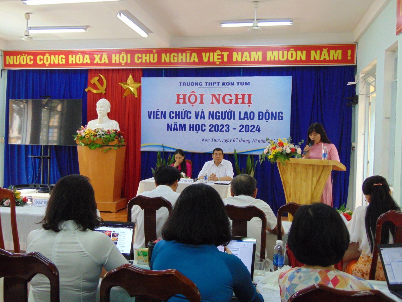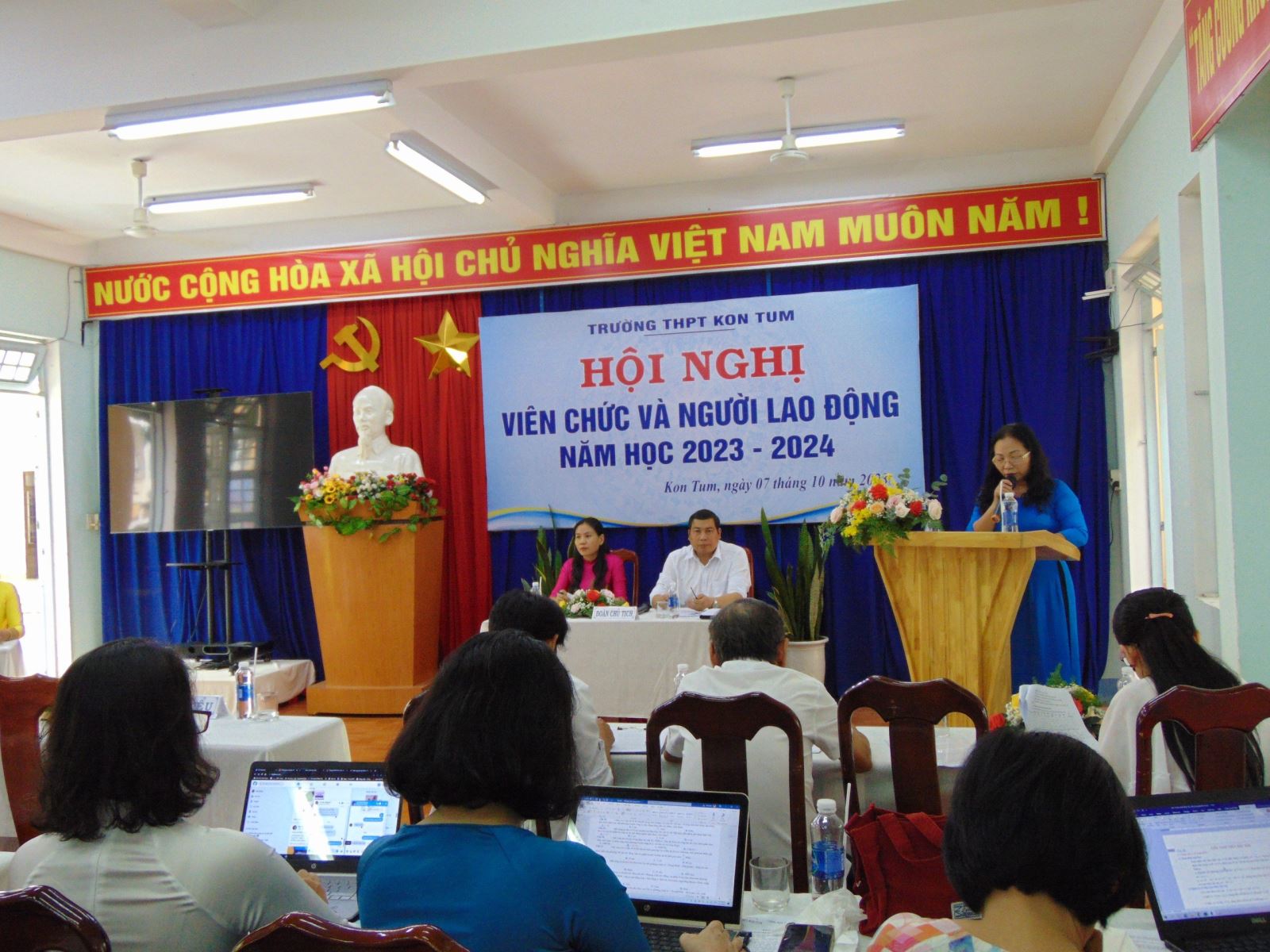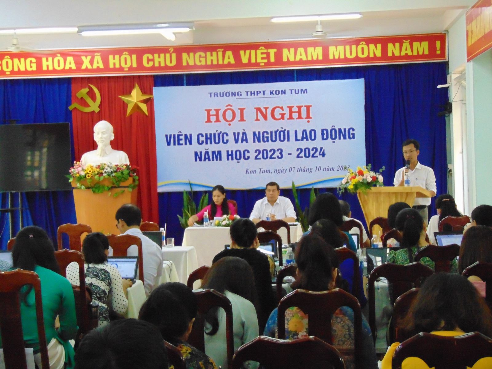 Thực hiện công văn hướng dẫn số 13/HD-CĐN ngày 12 tháng 9 năm 2023 của Công đoàn ngành Giáo dục, thực hiện công văn số 125/HK-SGDĐT ngày 18 tháng 8 năm 2023 của SGDĐT, Trường THPT Kon Tum đã tổ chức Hội nghị viên chức và người lao động năm học 2023 – 2024 vào ngày 07 tháng 10 năm 2023 để đánh giá việc thực hiện nghị quyết Hội nghị viên chức và người lao động năm học 2022 – 2023, đồng thời phát huy trí tuệ tập thể sư phạm để xây dựng phương hướng, nhiệm vụ và giải pháp cho năm học mới.